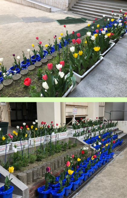 校舎に入ると、出迎えてくれるのが満開のチューリップです。