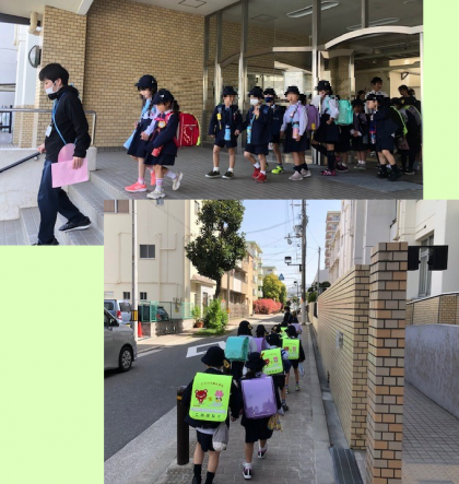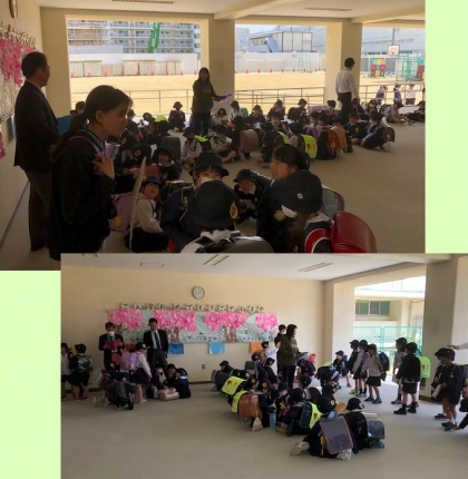 3クラスある子どもたちがピロティに降りてきて、みんながそろったら、さあ出発です。
