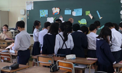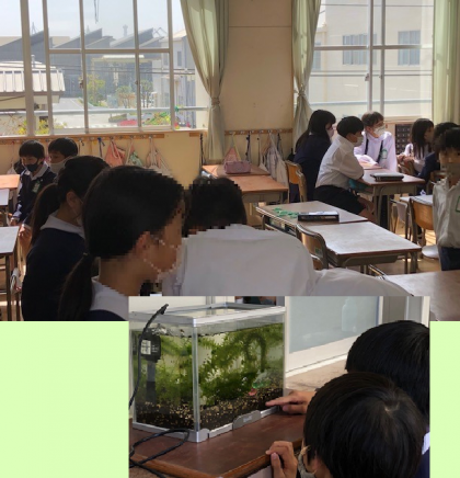 子どもたちは、それぞれの係に見合うイラストを求めて、さて、どうしようと思案を始めています。いち早く、生き物係の子どもたちが、廊下にある水槽をのぞき込んで、中にいる生物を描けばいいんじゃないかと相談しています。