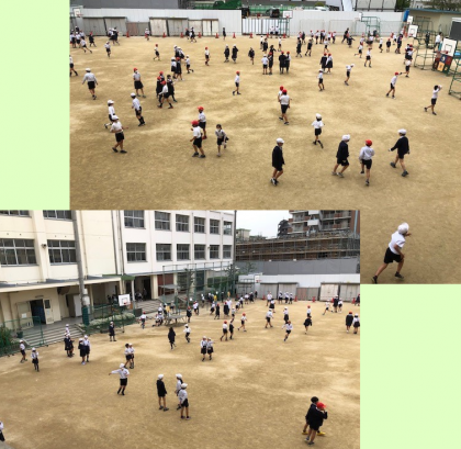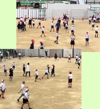 運動場に広がった大勢の子どもたちが、どの人も動き回ります。一人一人が何の法則もなく動きます。中にいる先生たちは、追いかけているのでしょうか、追いかけられているのでしょうか。運動場全体を一つの画面ととらえると、ウォーリーを探せの状態と同じように見えます。