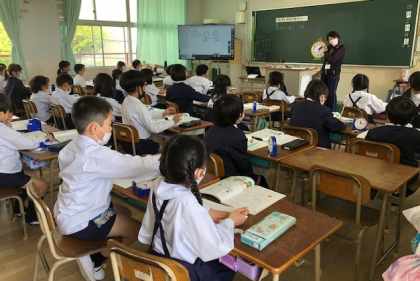 2年1組の5時間目。先生が模型の時計を手に、子どもたちに説明しています。