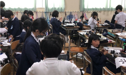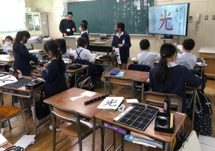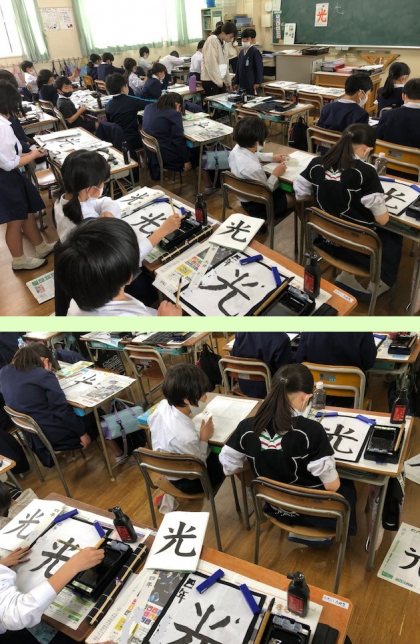 4年1組と2組。3時間目の学習は、どちらも習字でした。