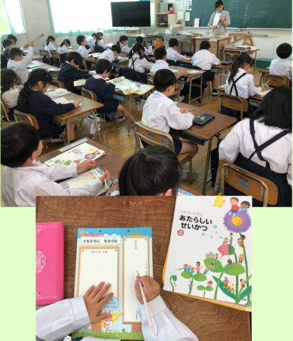 右の縦長の枠には自分の名前を書いて、書き終わったら左の四角い枠に自分の顔を描いて自己紹介をしましょうという先生の指示です。