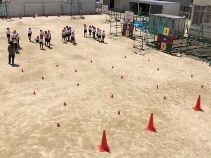 小さいコーンがコースの左右に並べられていて、それの外側をぐるりぐるり回って、大きいコーンをターンしてくるようです。