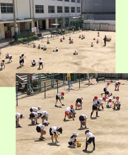 3時間目の運動場。南東の方で活動するのは、2年4組です。