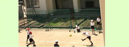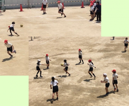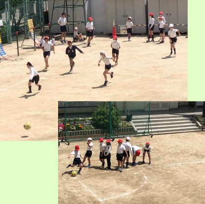 運動場の四隅を使って、コートを4つ取り、キックベースボールを始めていました。