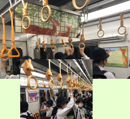 電車に乗るのが遅れ、出鼻をくじかれた感でしたが、近鉄電車に乗り込むと、なんと、つり革も車内掲示も鹿ばかりの「鹿電車」。幸先いいのかな。