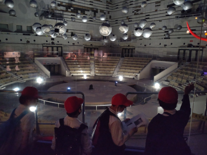 天井から面白そうなものがぶら下がっているホールもありました。1970年当時は「スペースシアター」というホールがあり、最新技術を終結した音響システムが導入されて音楽とレーザー光線によるショーが人気を集めていたようで、当時の様子をリアルに体感できるようになっているようです。