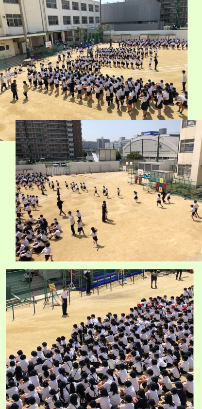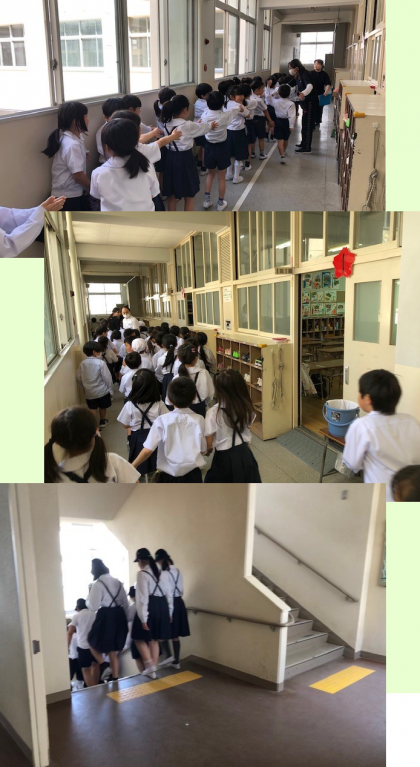 二次避難の指示の放送が入り、子どもたちは教室を出て運動場に集まります。