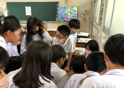 先日、校外学習で出かけた万博記念公園のシンボル、1970年にあの地で開催された大阪万博のシンボルの塔です。2025年に、また大阪で万博が催されることとなっており、しかも場所は舞洲です。子どもたちはそのことに何を感じるか、この作品の制作過程で、いろんな想いや気づきが芽生えるのでは、という期待もあります、と担任の先生は言っています。