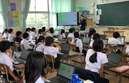 今日はICTの支援員さんを先生に、2年生がプログラミングの学習をしました。