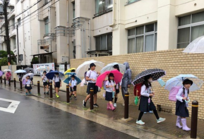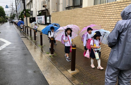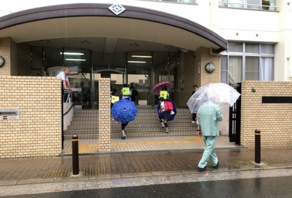 朝。雨の中を子どもたちが登校です。傘の花が咲く風景になりました。
