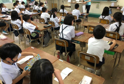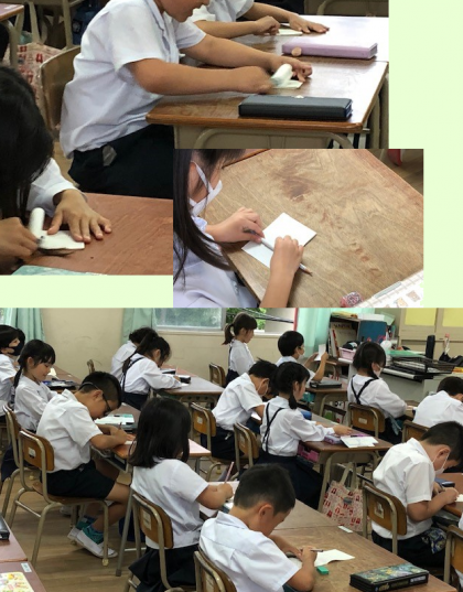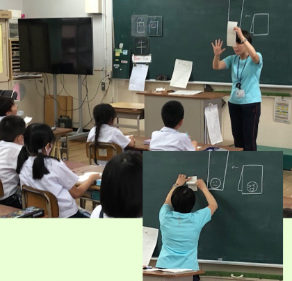 先生から、縦長の薄い紙を配られた子どもたちは、それを二つ折りにすることを指示されます。子どもたちは、下になった方の紙に丸を描いてその中に顔を描き、折って上になる方の紙には、下の丸を透かして丸を描き、その中にさっきと違う表情の顔を描きました。