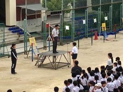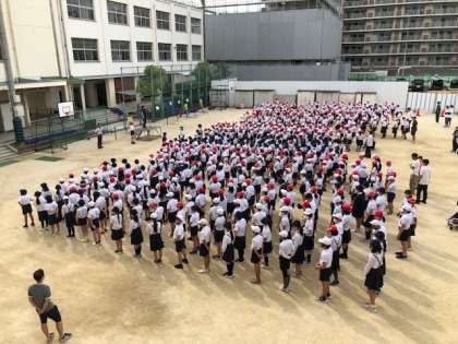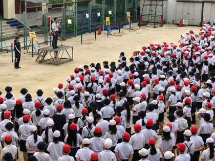 今日の朝会は運動場で行いました。校長先生のお話は、梅雨のお話でした。