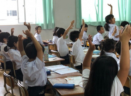 先生の「どんな形かな?」に、手で作ってみせる子どもたち。