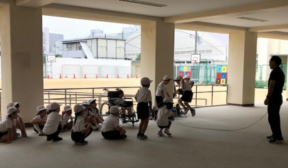 2時間目。ピロティから歓声が聞こえます。行ってみると1年2組の子どもたちです。