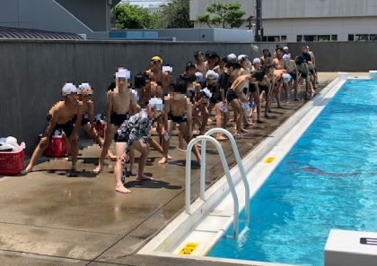 ピロティに集合してから、ドキドキしながらプールにやってきた子どもたち。