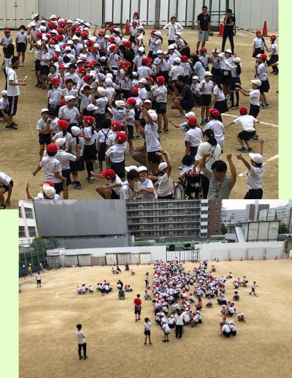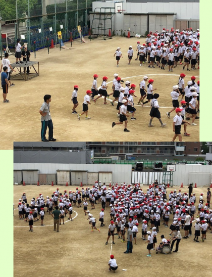 取り組んだのは、子どもたちが用意した〇×クイズです。出された問題の、どちらが正しいと思うか、運動場に書かれた〇か×の方に移動します。