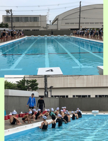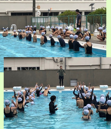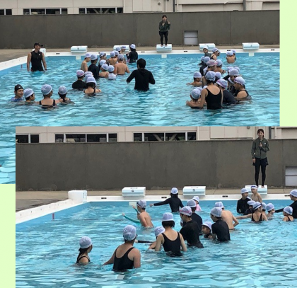 バディの確認、シャワーの浴び方、プールサイドから水に入るときの順。