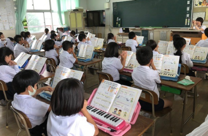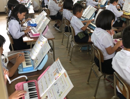 その前に、使う指の練習です。右手と左手の指を向かい合わせに、子どもたちは、「ソ・ミー」「ソ・ミー」…と指を動かしていました。できたところで、さあ本当に弾いてみましょうと、ふき口をくわえて準備です。