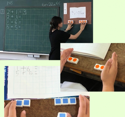 1年2組の3時間目。算数の時間です。子どもたちは、おはじきを前にたしざんの学習をしていました。