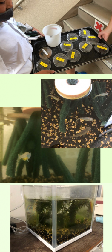 階段を、シャーレをたくさん持った児童がすり抜けていきます。中身は何かと尋ねると、メダカの卵とのこと。