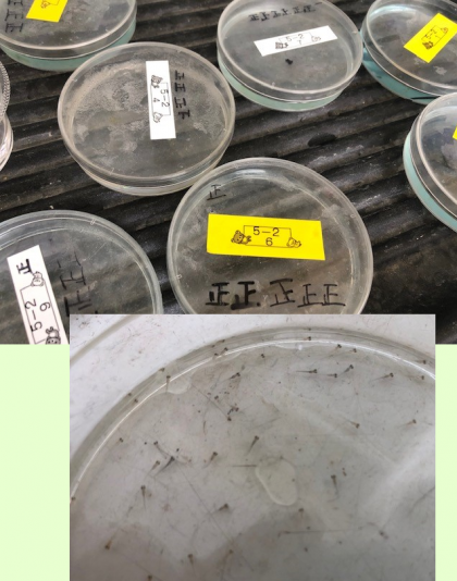 今、5年生が理科の学習で、各クラスの教室前に水槽を置いてメダカを飼い、数を競っているそうです。シャーレは、メダカの卵を見つけたら入れる容器です。水槽から採取して入れたら「正」の字を書いて数を確認するという手順。クラスによって差があって、多いところでは何百もの卵を取り孵化させていて、今日も、理科の先生がシャーレから赤ちゃんメダカを専用の水槽に移していました。