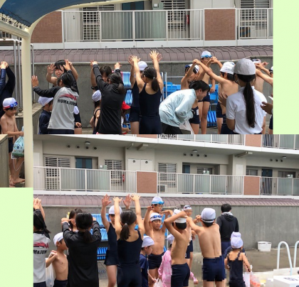 先に到着して待ち構えていた6年生が、花道を作って1年生をプールに迎え入れます。