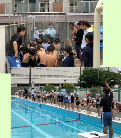 みんなの前に出てきた6年生は、忍者の設定。全体の体操やみんながシャワーを浴びるのを仕切ります。