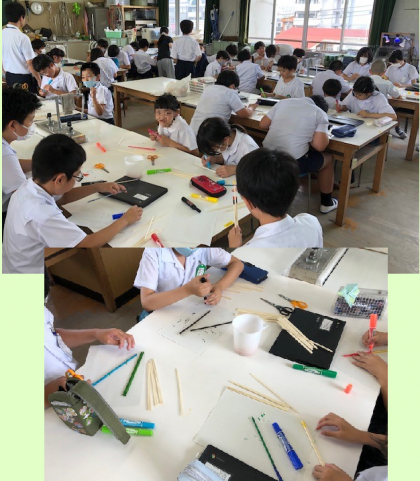 理科室で活動するのは科学クラブです。今日は、割り箸を使って、何やら制作するようで、担当の先生が、手元をカメラで撮ってそれをモニターで流し、子どもたちに作り方を解説しています。