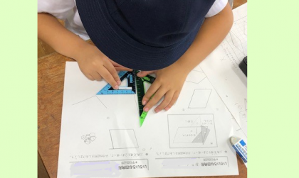 4年生は図形の問題で、次から次、三角定規を使って平行線や平行四辺形を書きました。