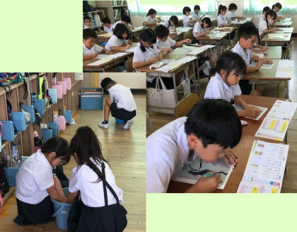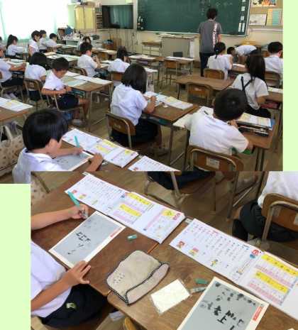 2年1組の2時間目。漢字ドリルを前に、子どもたちは不思議な筆をもって、何かに文字を書いています。