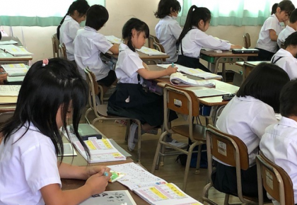 めいめいの机の上にあるのは「水書きシート」です。インクの代わりに水を使う専用のペンで文字を書くと、そのうち自然と乾いて文字が消え、何度も練習できる仕組みになっています。