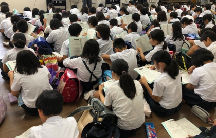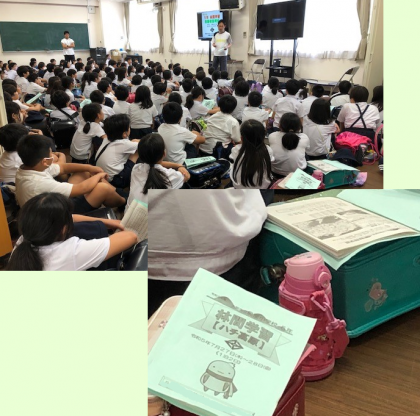 6時間目。5年生が、冊子になった林間学習のしおりを手に、多目的室に集合です。2週間後に迫った林間学習について、子どもたちが詳細の説明を受けました。。