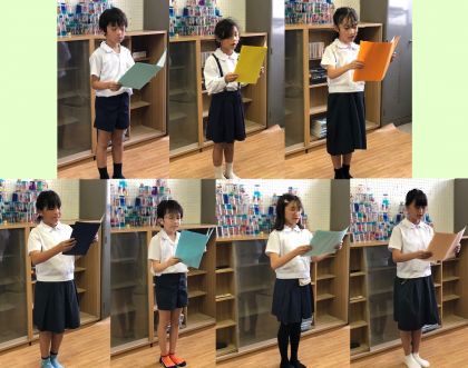 そのあと、3年生と6年生のクラス代表が、この1学期を振り返って、感じたこと、頑張ったこと、今後こうしたいことなどを、作文にして、読み上げました。