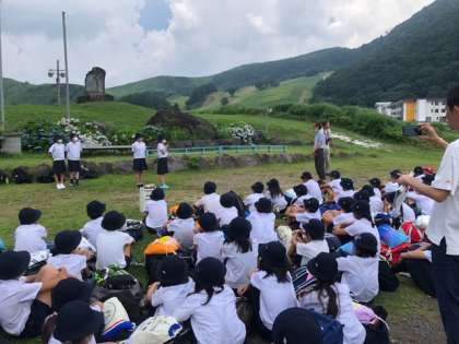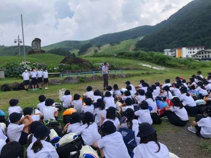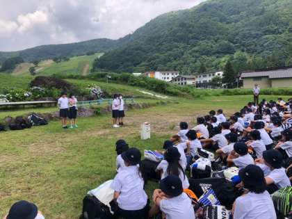 昼食後は、宿舎の前で開舎式です。児童代表のあいさつ、宿舎の方から、周囲の説明などがあり、これから宿舎の部屋に入って行きます。