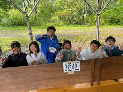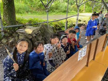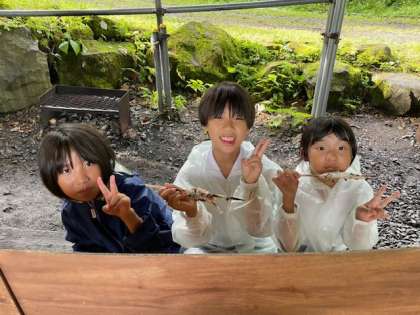 捕まえたアマゴを、串に刺して塩焼きでいただきました。