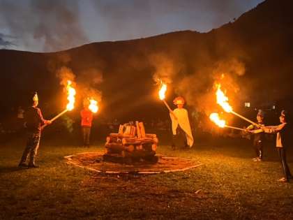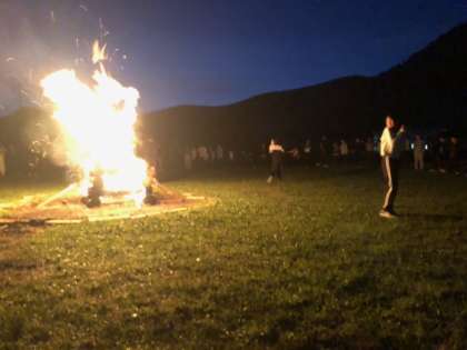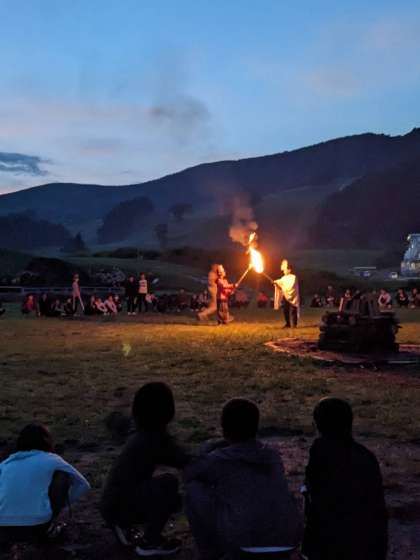天気も回復して、キャンプファイヤーが始まりました。セレモニーでは、火の神が火の精に、火を与え、その火が真ん中の灯され、大きな炎となりました。