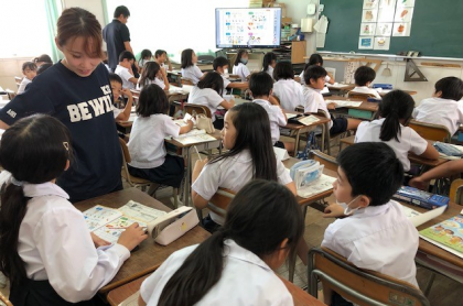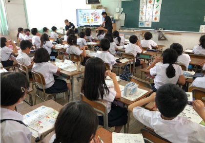 3年3組の6時間目。専科の先生が来て、担任の先生も一緒に英語の学習です。