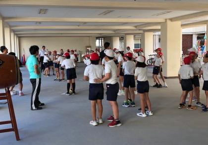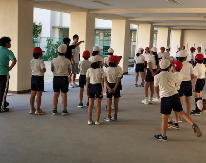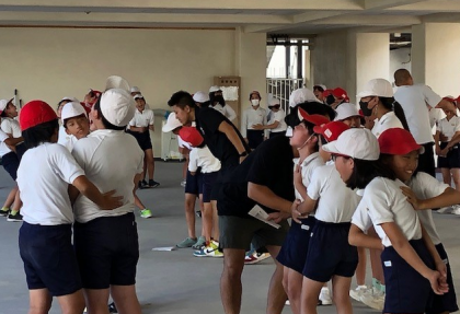 夕方、ピロティの方から子どもたちの大きな声が聞こえてきました。
