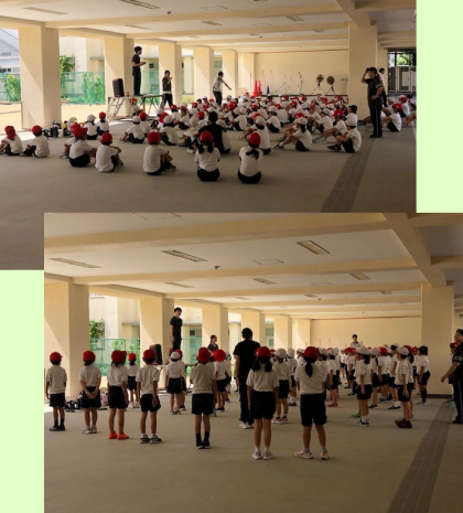 1年生が運動会のダンスの練習をしていたようですが、ちょうど終わってしまったところで、子どもたちは集合している状態で、先生の話を聞いていました。