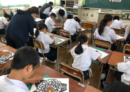 机の上にはきれいな花の切り絵の図柄。4種の中から好きなものを選んで、子どもたちは線に合わせてカッターナイフで切り込んでいました。