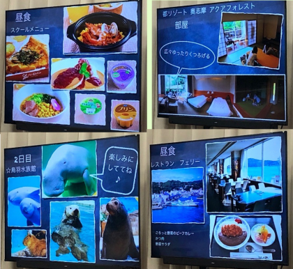 担任の先生たちが、映像と共に旅程や持ち物、その他注意事項について、保護者の方々へ詳しく伝えました。赤福餅とお小遣いのこと、携帯電話のことなども、ご理解いただけたと思います。楽しく有意義な行事となるようご協力よろしくお願いいたします。