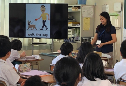 時間の表し方を学習した後、モニターの画面に出てくるイラスト付きの英語を読む、ということに取り組み始めました。