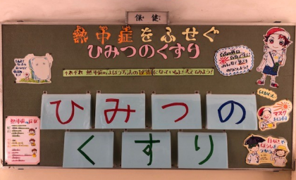 休み時間にでも保健室前へ行って、熱中症にならないための「くすり」を学習しましょうね。