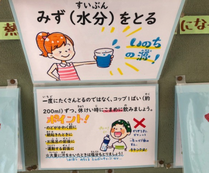 保健室の前。「熱中症をふせぐひみつのくすり」と題した掲示物があります。