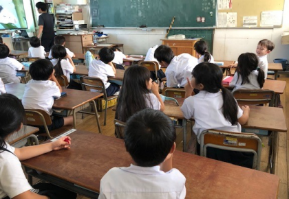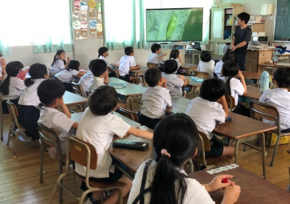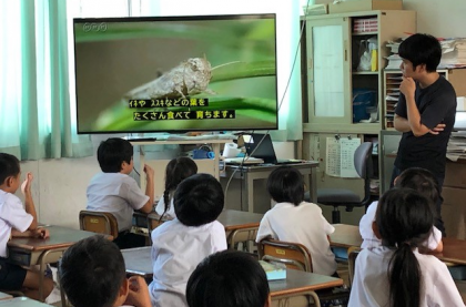 5時間目。1年3組の教室を覗くと、画面に映し出された映像をみんなで見ていました。虫さんたちの様子を映したDVDです。