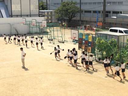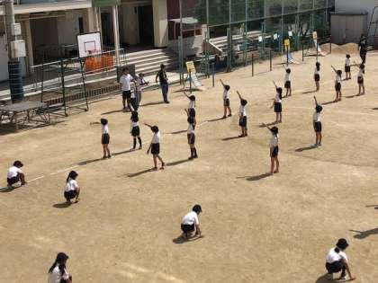 演技前の入場の練習でしょうか。運動場いっぱいを四角く動いていきますが、スキップがとても楽しそうに見えます。
