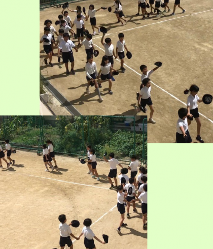 3時間目。手に紺の制帽をもってスッキップで進む3年生の子どもたちが見えます。