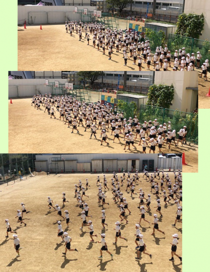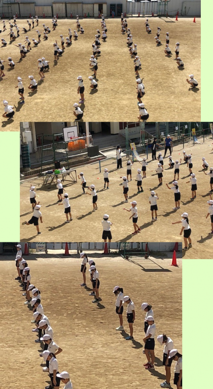 大きく広がってのダンスの練習。子どもたちは、「横をよく見て」と指示があるように、隣や前を見て均一に広がれているか、列が歪んでないか、しっかり目で確認しています。